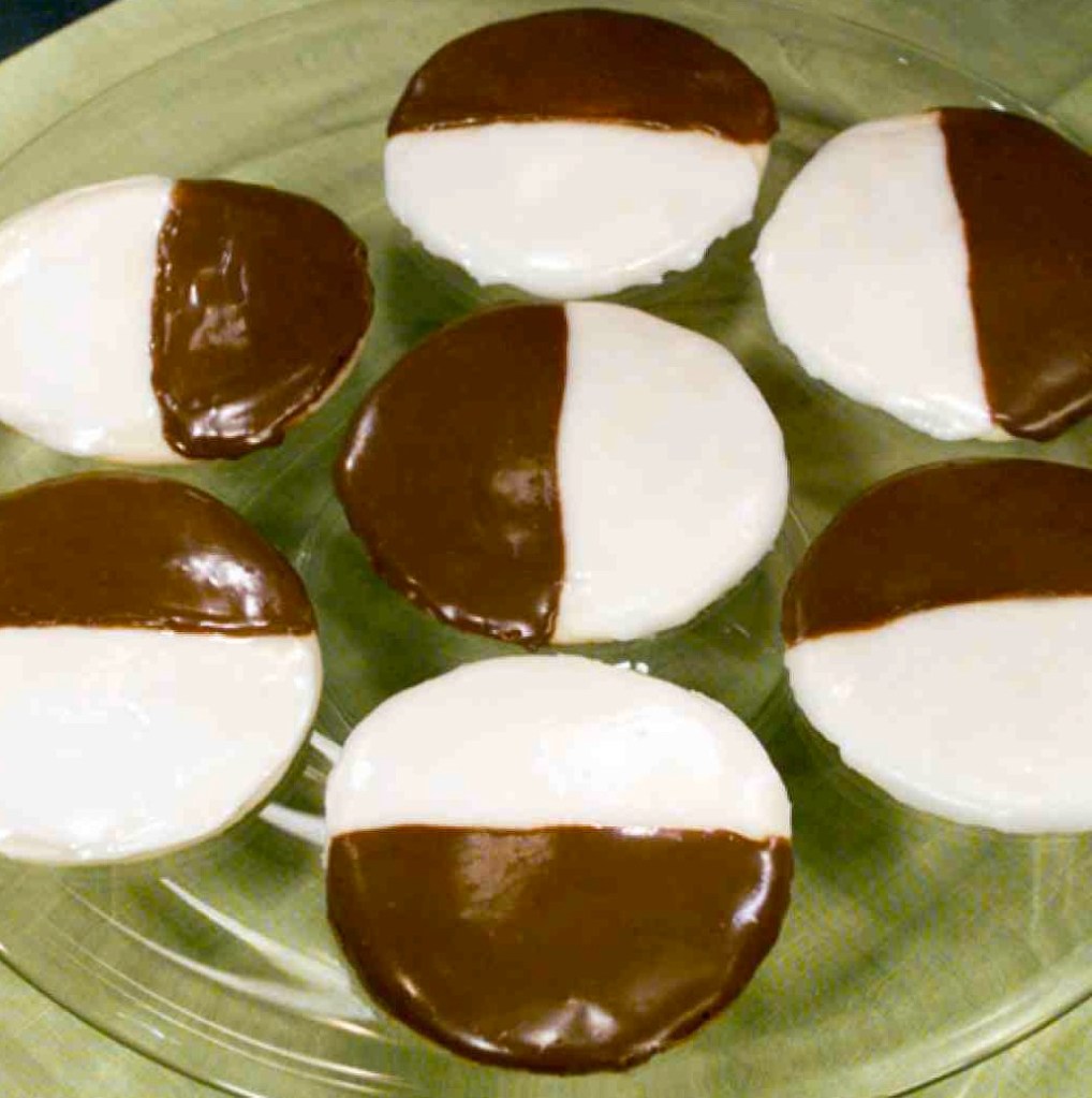 For the vanilla glaze, whisk together the confectioners’ sugar, corn syrup, vanilla, and 2 tablespoons of the cream, adding drops of cream until the glaze is smooth, thick, and barely pourable. Holding the cookie in your hand, with a spoon, pour the white glaze over the unglazed half of each cookie right up to the chocolate glaze. You can smooth it out with an offset spatula, if you need to. Allow to set for 30 minutes. Serve at room temperature. Enjoy!