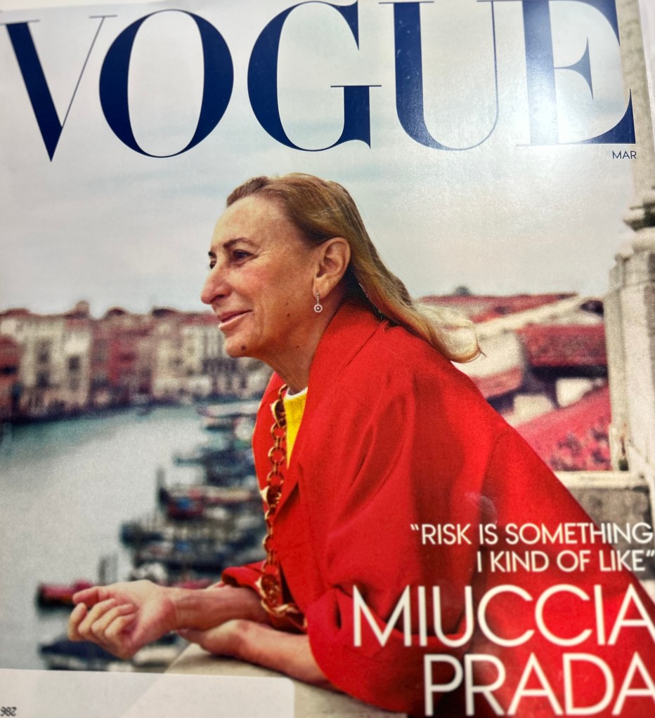 9. “POWERFUL WOMAN” POSTER-GIRL: Miuccia Prada on the cover of “Vogue” in a red silk coat from the Prada collection, at prada.com