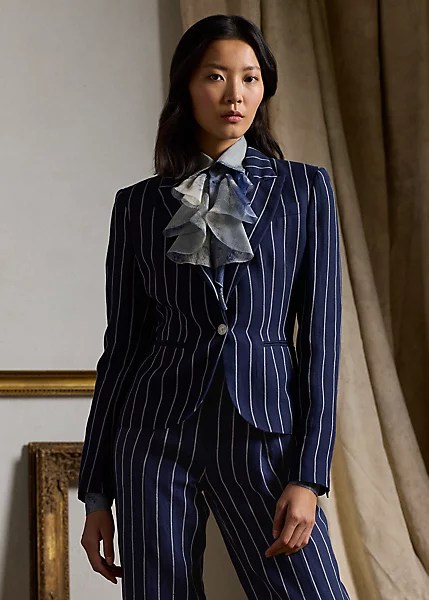 6. PINSTRIPES & PRETTY BLOUSES: Aaiden navy & white pinstripe jacket & pants with light blue floral ruffled blouse at ralphlauren.com