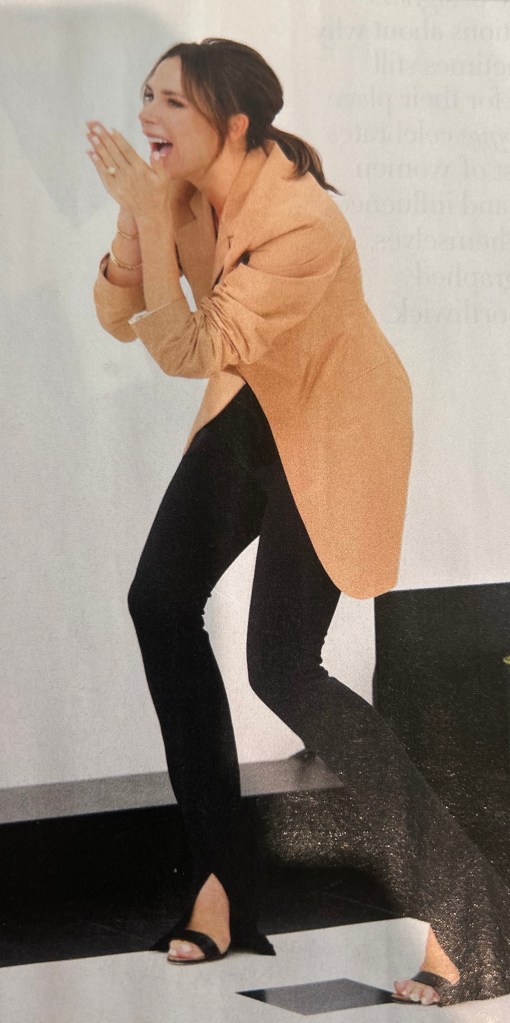 5. THE MEANING OF “FIERCE,” SHE’S GOT IT ALL–TALENTED, SMART & BEAUTIFUL ! Victoria Beckham in a bold shouldered camel jacket & black flared pants from victoriabeckham.com