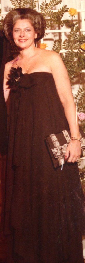 EVERYTHING OLD IS NEW AGAIN: My mom in Halston in the 60’s; Cindy Crawford in a modern version–black sequin gown from Donna Karan’s new “Powerful Women” line at donnakaran.com