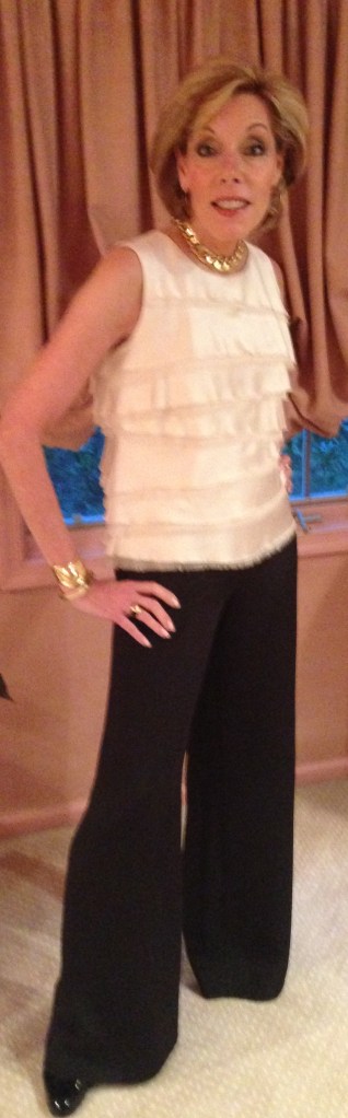 THE PROLIFERATION OF PANTS: Michael Kors Collection ivory silk tiered top from neimanmarcus.com; Avenue Montaigne black sheer wool pants from Grove 121 in Bryn Mawr