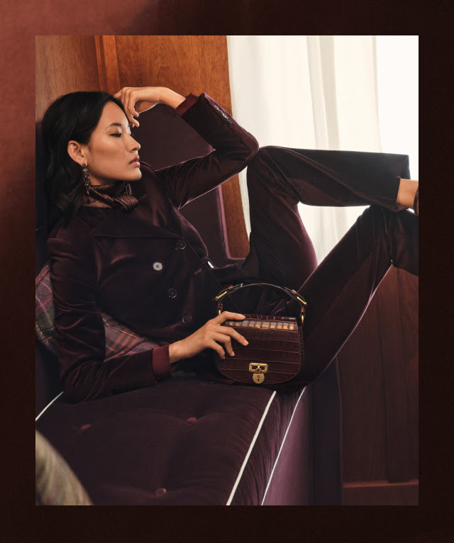 POLISHED & PULLED-TOGETHER: Mix & match–flared olive & burgundy plaid pants & jacket; flared burgundy velvet pants & jacket, all from ralphlauren.com
