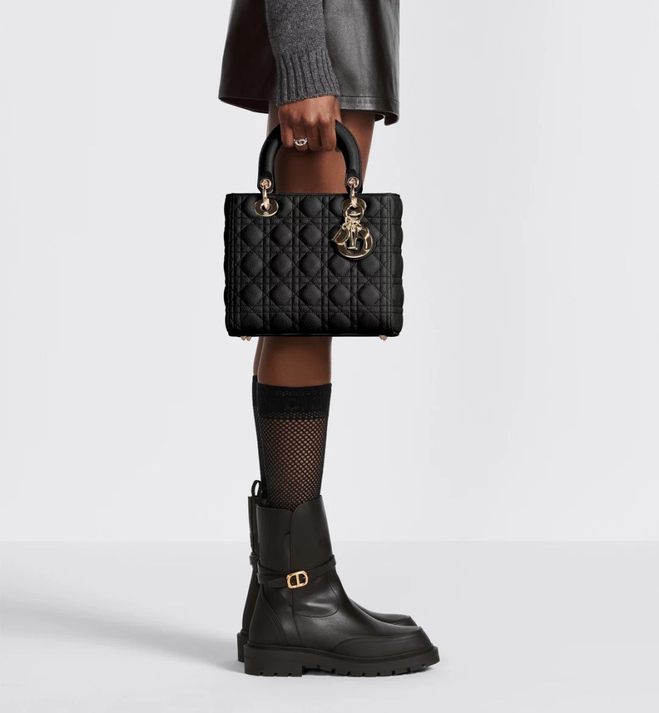 COOL, CLASSIC & FIT FOR A PRINCESS: Created for Princess Diana–so her handbag wouldn’t ruin the line of her clothes–this season’s “Lady Dior” bags, with & without studs, Princess Diana carrying her black calf Lady Dior, all from dior.com