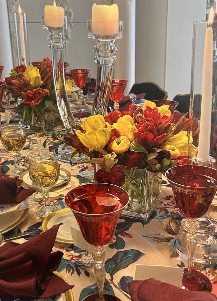 SETTING YOUR TABLE, SETTING THE MOOD: Another holiday table, candelabra from Home Grown in Haverford; red Venetian goblets that were my mother’s; Minton gold-rimmed china, my original wedding china