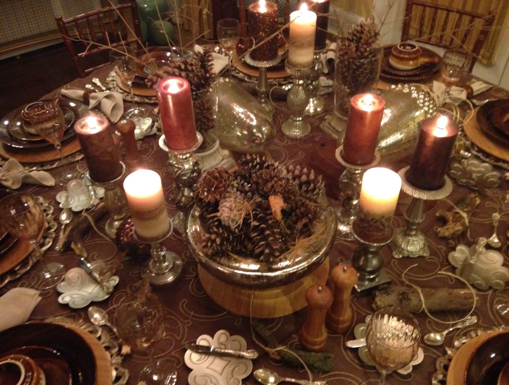 GAIL’S GORGEOUS TABLE: My dear friend Gail & her gorgeous Thanksgiving table—Gail has golden hands & makes her own tablecloths, I bought fabric & had the store make them for me!