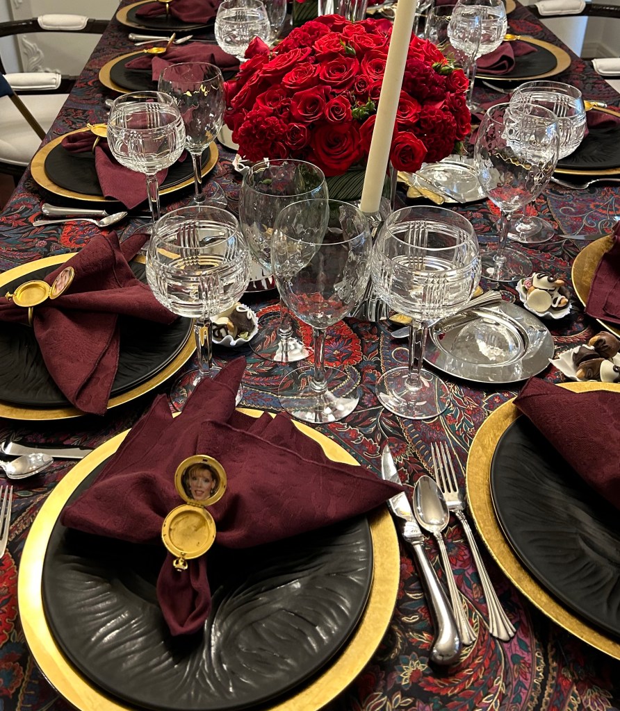 MY FANTASY THANKSGIVING TABLE, WHO WOULD YOU INVITE TO YOURS? Notice Joan Rivers’ picture in the napkin ring! Limoges dishes, bought in Paris, soup bowls that look like cabbages, found in a catalogue