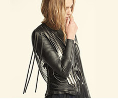 3. SOMETHING LUXURIOUS: Bottega Veneta plum leather handbag & black leather coat from bergdorfgoodman.com; black leather biker jacket from neimanmarcus.com