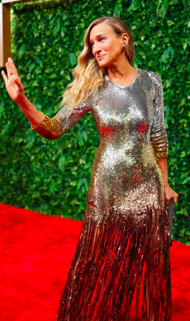 THE NIGHT TO SPARKLE: Sarah Jessica Parker in Oscar de la Renta in NYC; an array of metallic looks at ralphlauren.com