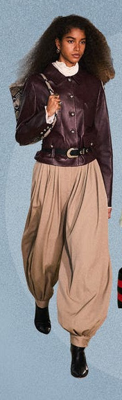 DRESSY & LEATHER PANTS: Camel silk harem pants & chocolate leather jacket from altuzarra.com; from my closet, Altuzarra b/w wide-leg pants & Ralph Lauren leather leggings from saks.com, L’Agence cognac leather jeans from Boyds