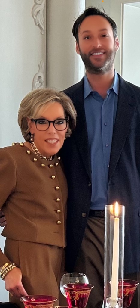 WHAT’S IN MY CLOSET? With my son Jonathan (who is surely “one of my favorite things!!”) at Rosh Hashanah dinner last week, wearing a favorite Carolina Herrera jacket & pants—I often separate the pieces, mixing & matching with black leather pants & chunky sweaters, from neimanmarcus.com