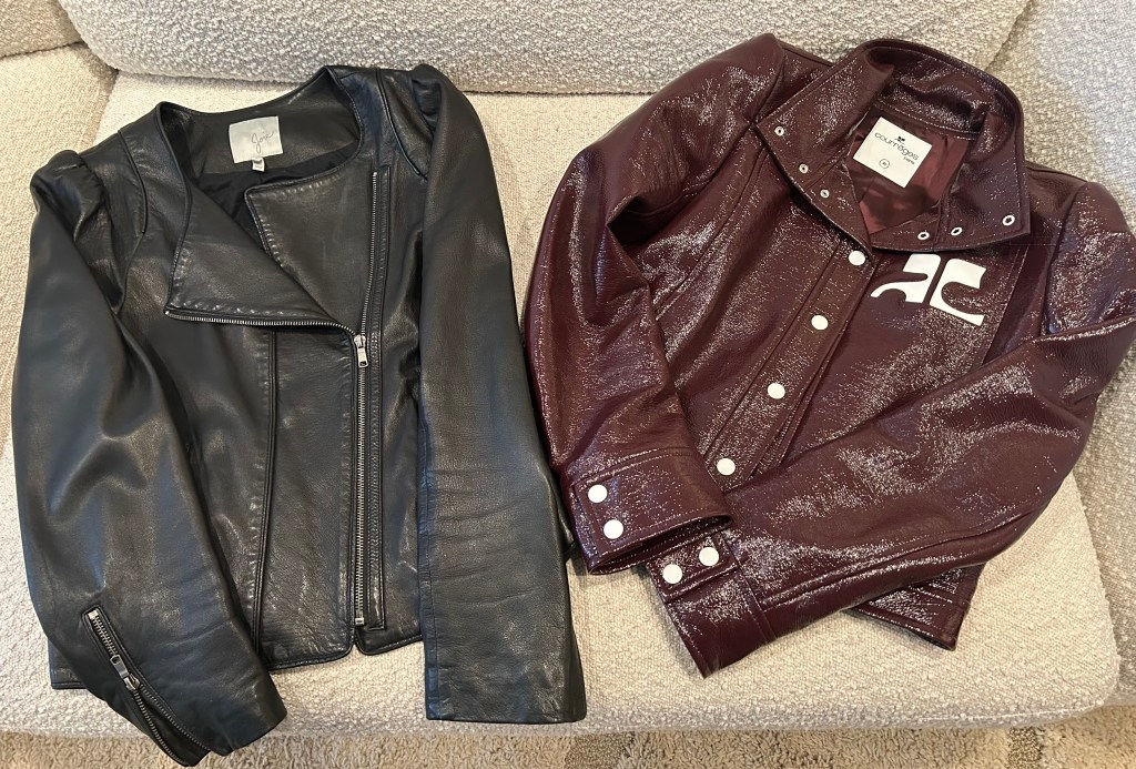 LEATHER JACKETS: Always a “go-to” for me, burgundy leather coat from tomford.com; from my closet, Joie black moto jacket from neimanmarcus.com & Courreges burgundy jacket from Boyds in Philadelphia & Wayne