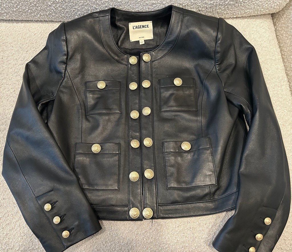MILITARY-STYLE JACKETS: Also a look I love, taupe velvet double-breasted jacket at armani.com; from my closet, cropped vegan leather jacket at l’agence.com