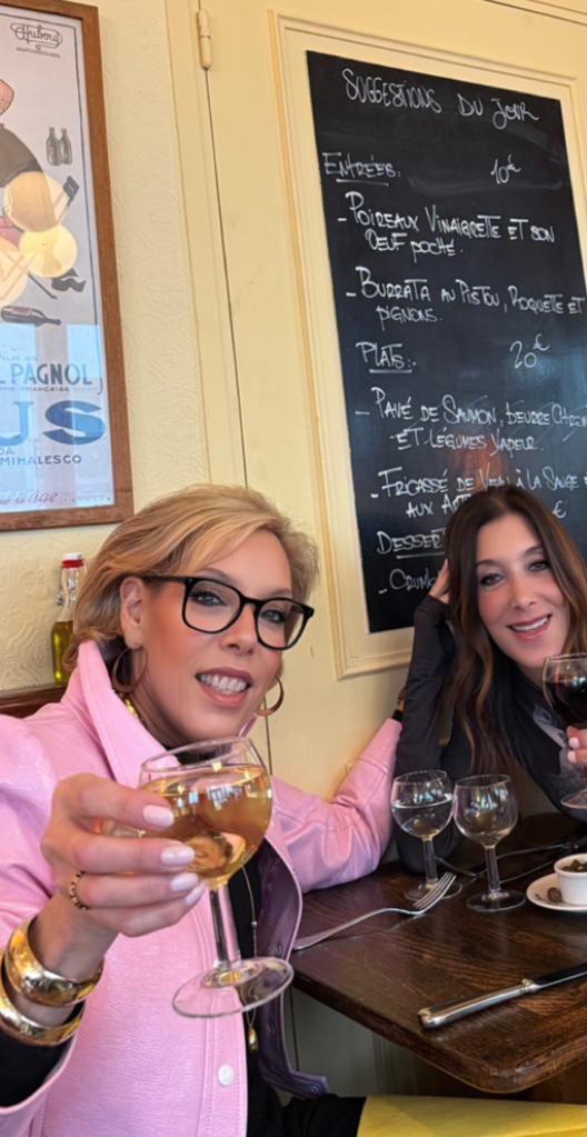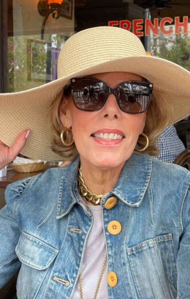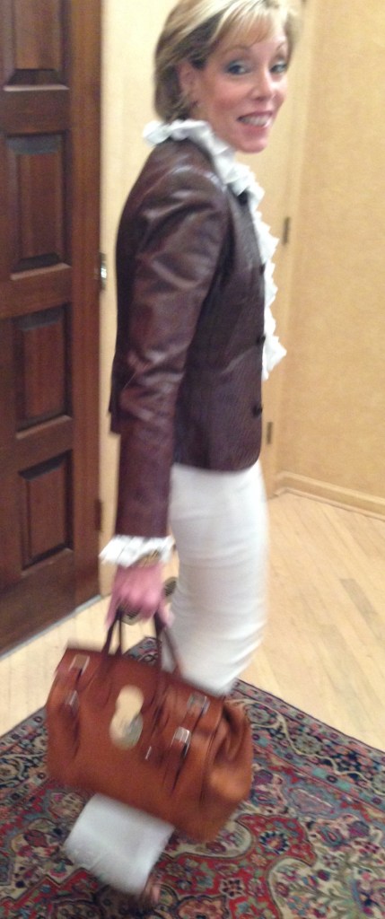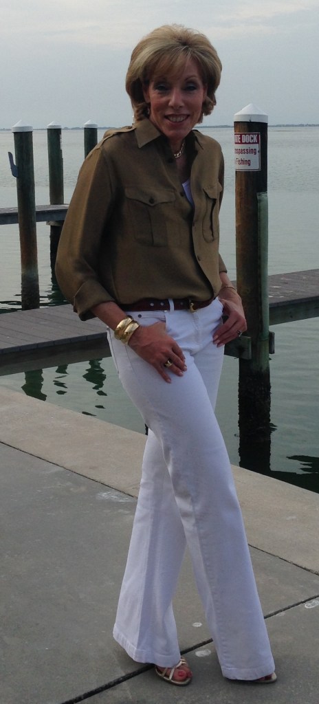 LOVE A LEATHER JACKET, JEAN JACKET OR BLAZER: A cold evening in Paris with my dear friend Susie, in my pink leather Courreges jacket from Boyds in Philadelphia & Wayne; a cool day in Boca Raton in my favorite Marc Jacobs jean jacket, from neimanmarcus.com; I also like a blazer for travel–I love pockets—from veronicabeard.com