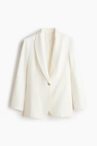 BUTTON UP: Good buttons are always a “tell;” if an item is inexpensive, change them to “up” your look—ivory linen jacket from h&m.com; pearl buttons from etsy.com