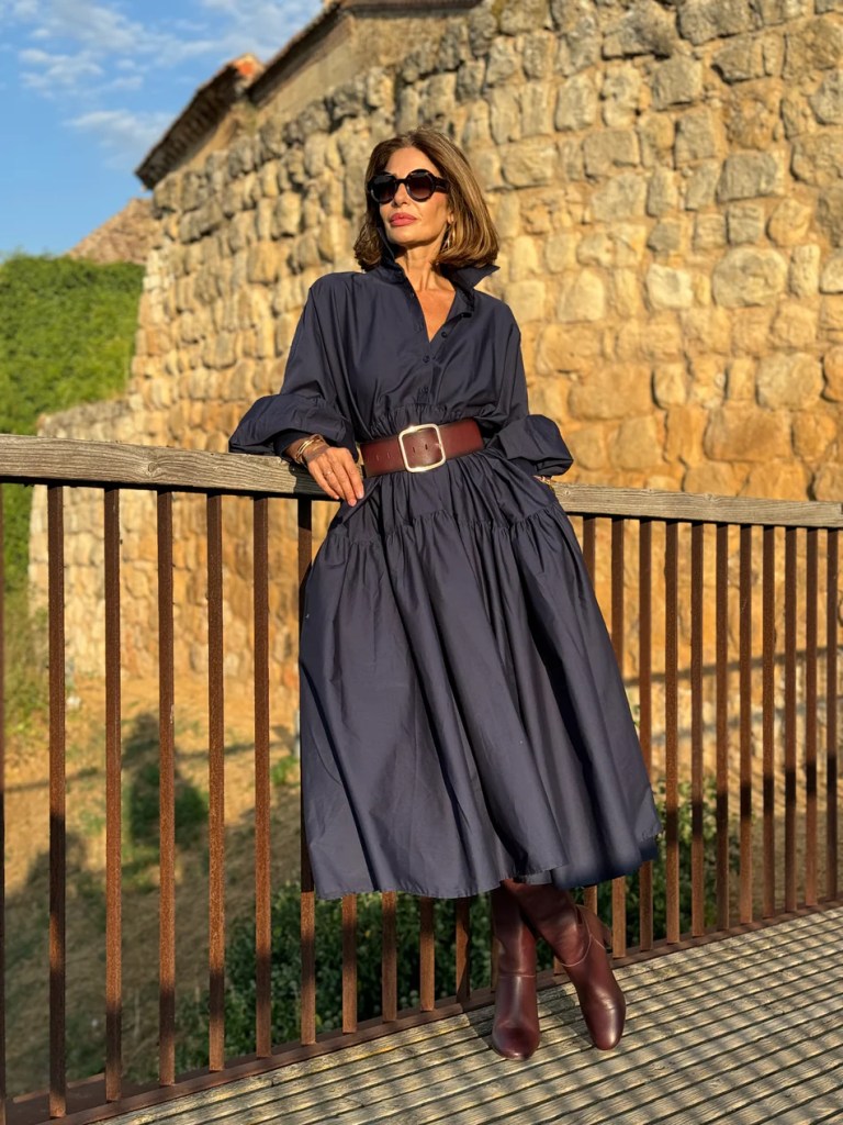 CHIC AT 60ISH: Two new not-super-expensive lines I’ve found—navy polished cotton dress from mariellestokker.com; mocha silk jumpsuit & off-the-shoulder sweater from jaki.com